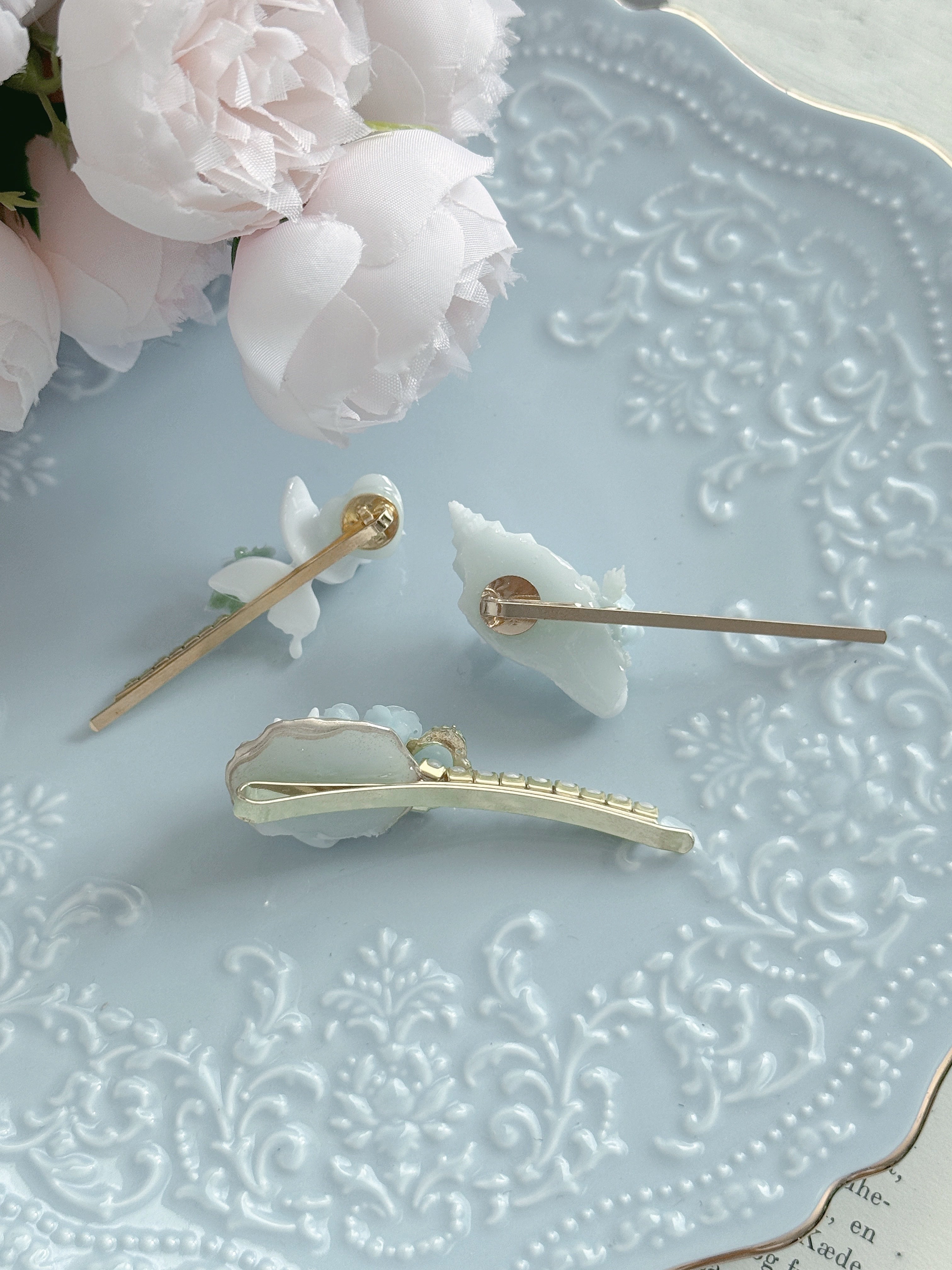 2本目は、パステルブルーのハートと貝、そして真っ白な蝶が舞うビジューピン。